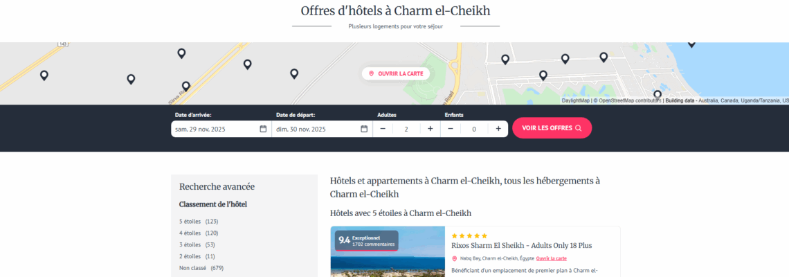 Réservation en ligne d'hôtels à Charm elCheikh, Égypte. Bonne disponibilité et tarifs avantageux. Pas cher et sécurisé, payez à l'hôtel, sans frais de réservation.